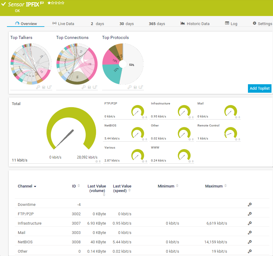 For all Flow (NetFlow, jFlow, sFlow, IPFIX) and Packet Sniffer sensors, Toplists are available on the sensor's Overview tab. Using Toplists, you can review traffic data for small time periods in great detail.