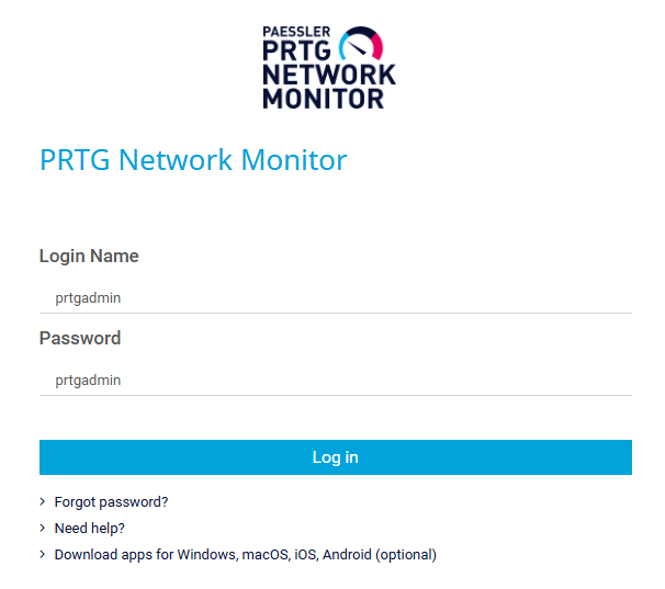When you log in for the first time, the login name and password for the predefined PRTG System Administrator user account are both prtgadmin. PRTG automatically fills in the default credentials and shows the password in plain text.