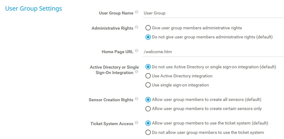 To add a new user group to PRTG Network Monitor or to PRTG Hosted Monitor, hover over and select Add User Group from the menu. The options are almost the same as for editing user groups.
