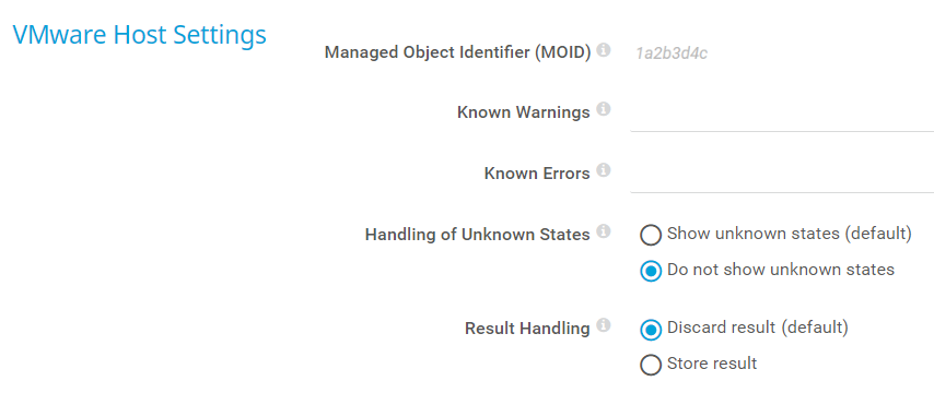 Enter one or more warning messages from the VMware host that you want to ignore. Use semicolons (;) as separators, for example, Power Supply 7;Power Supply 8. Enter a string or leave the field empty.