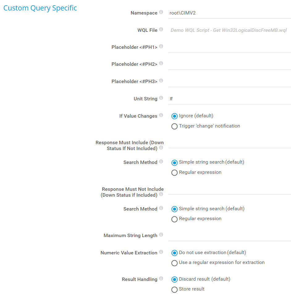 The WMI Custom String sensor performs a custom string query via Windows Management Instrumentation (WMI).